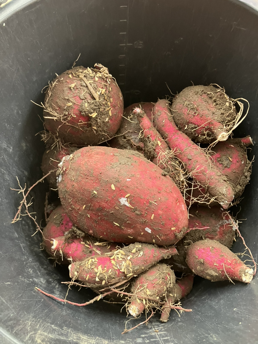 農薬や化学肥料を一切使用しないアグリボルタイクス自然栽培農園で今季初のサツマイモ収穫を行いました。サツマイモの収穫は、植え付けから約4~5か月後、葉や茎が黄色く枯れ始める頃が目安です。具体的には、晴れた日に収穫し、茎を根元から4~5cm残して刈り取った後、つるを切り分けてから、株元にスコップを打ち込んで掘り出します。収穫後、数週間貯蔵すると甘みが増します。