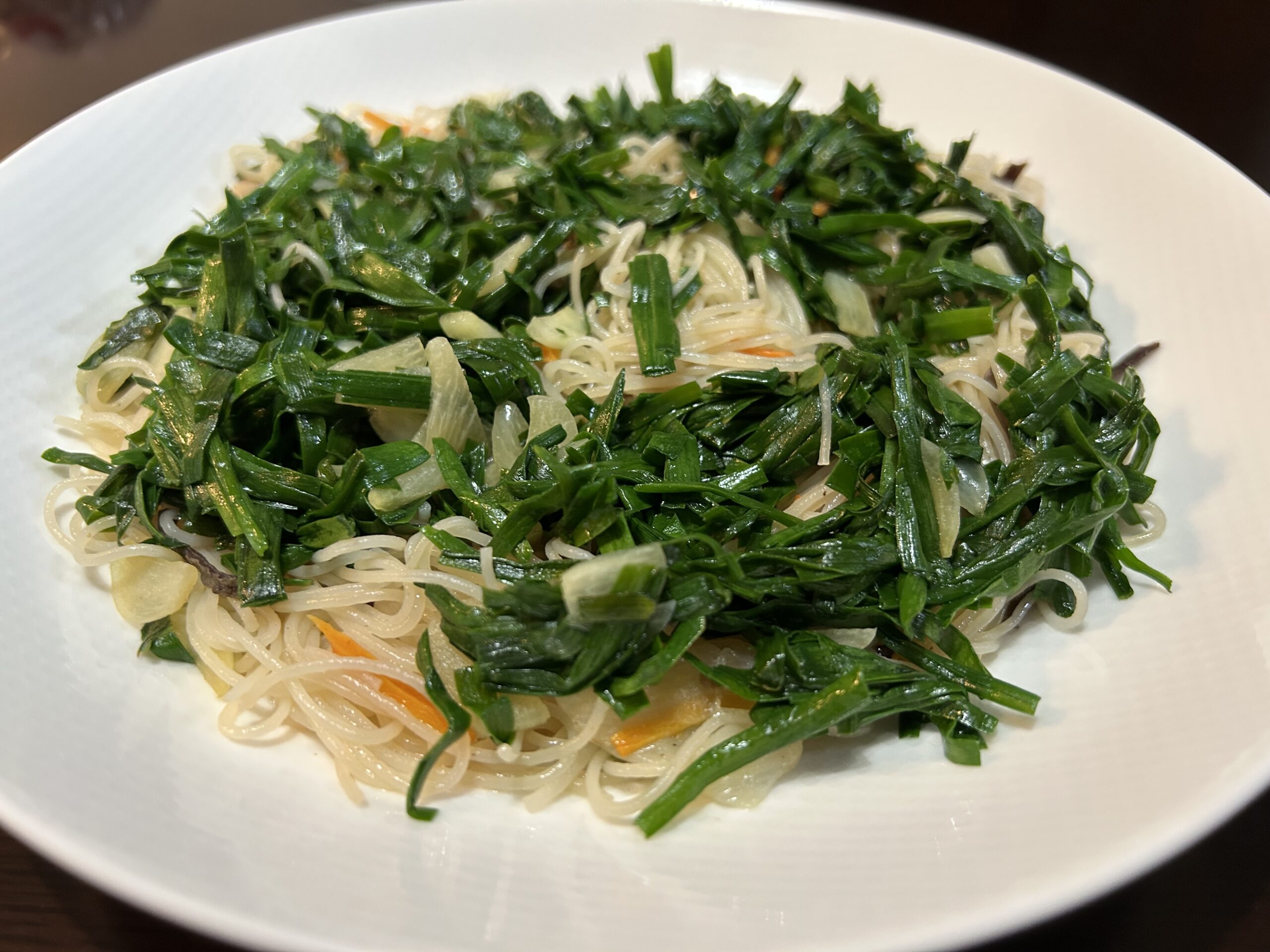 写真は農薬や化学肥料を一切使用しないアグリボルタイクス自然栽培農園で採れたニラをふんだんに使った焼きビーフンです。ニラの主な効能は、疲労回復、血行促進、体の保温、免疫力向上、アンチエイジングなどです。これらの効果は、ニラ特有の香り成分「アリシン」や、β-カロテン、ビタミンC、ビタミンE、カリウム、葉酸などの豊富な栄養素によるものです。