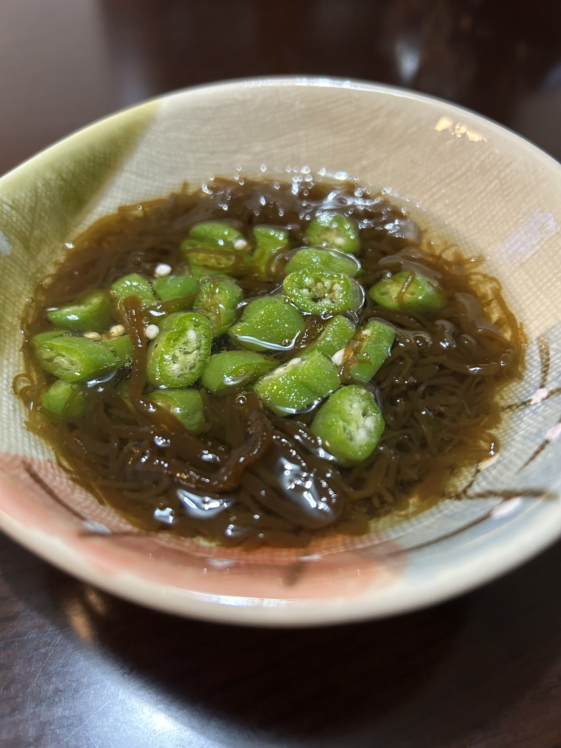 写真は農薬や化学肥料を一切使用しないアグリボルタイクス自然栽培畑で収穫されたオクラをもずくと一緒に和えた酢の物です。食前に酢の物を食べるのは、食後の血糖値の急上昇を抑え、満腹感を得やすくする効果が期待できます。空腹時は胃腸に刺激が強いため、食前に酢を原液で摂取するのは避け、酢の物として食べるのがおすすめです。自然栽培オクラは後味もスッキリ、酢の物の具材としては適役です☺