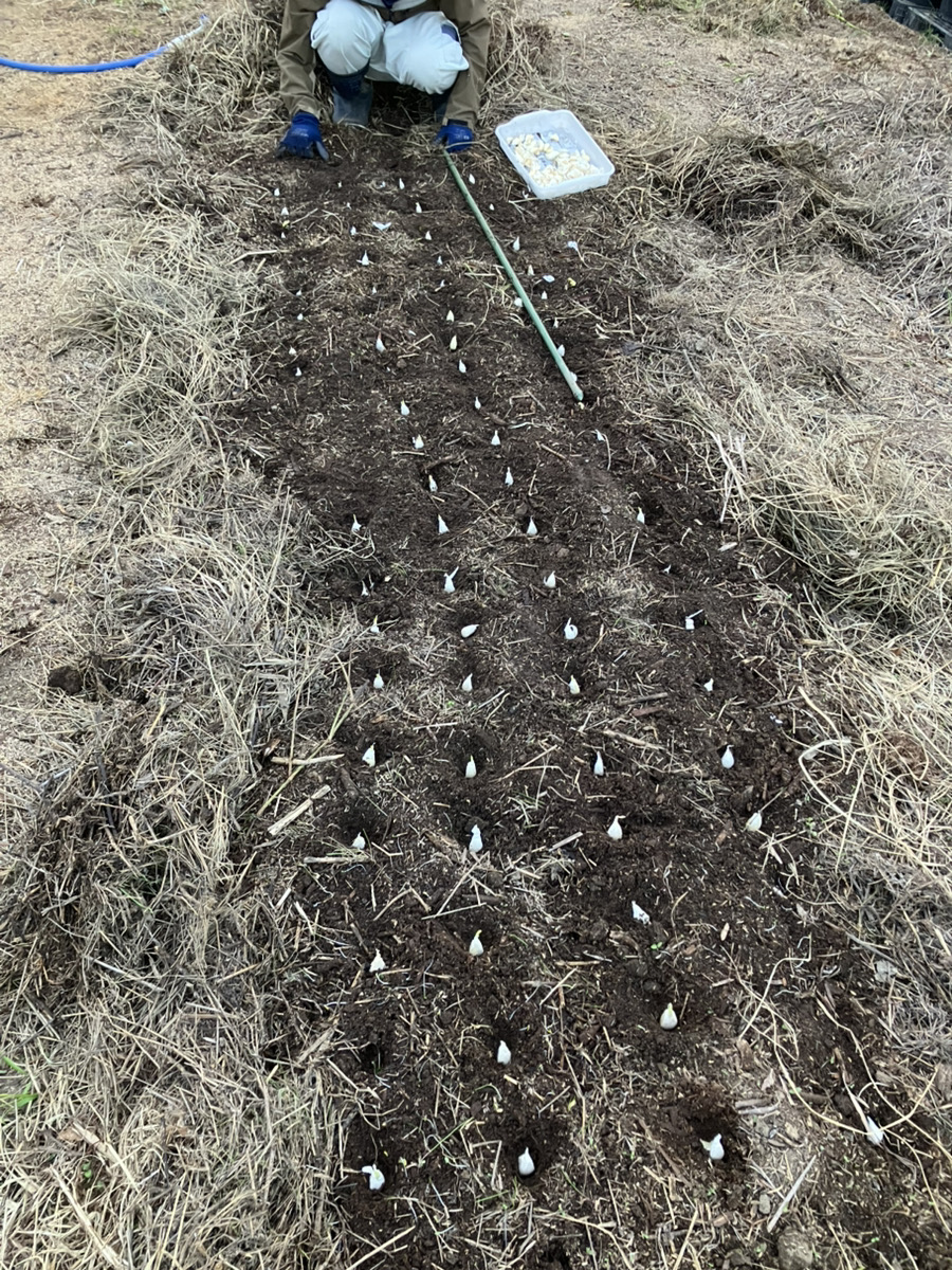 空心菜といった夏野菜の後作にニンニクを植えることは、病原菌を殺菌し土壌をリフレッシュするのに有効な方法です。ニンニクが持つ殺菌効果や、根の周りの微生物が病気を防ぐ効果が期待できます。農薬や化学肥料を一切使用しないアグリボルタイクス自然栽培農園ではニンニクを定植しました。