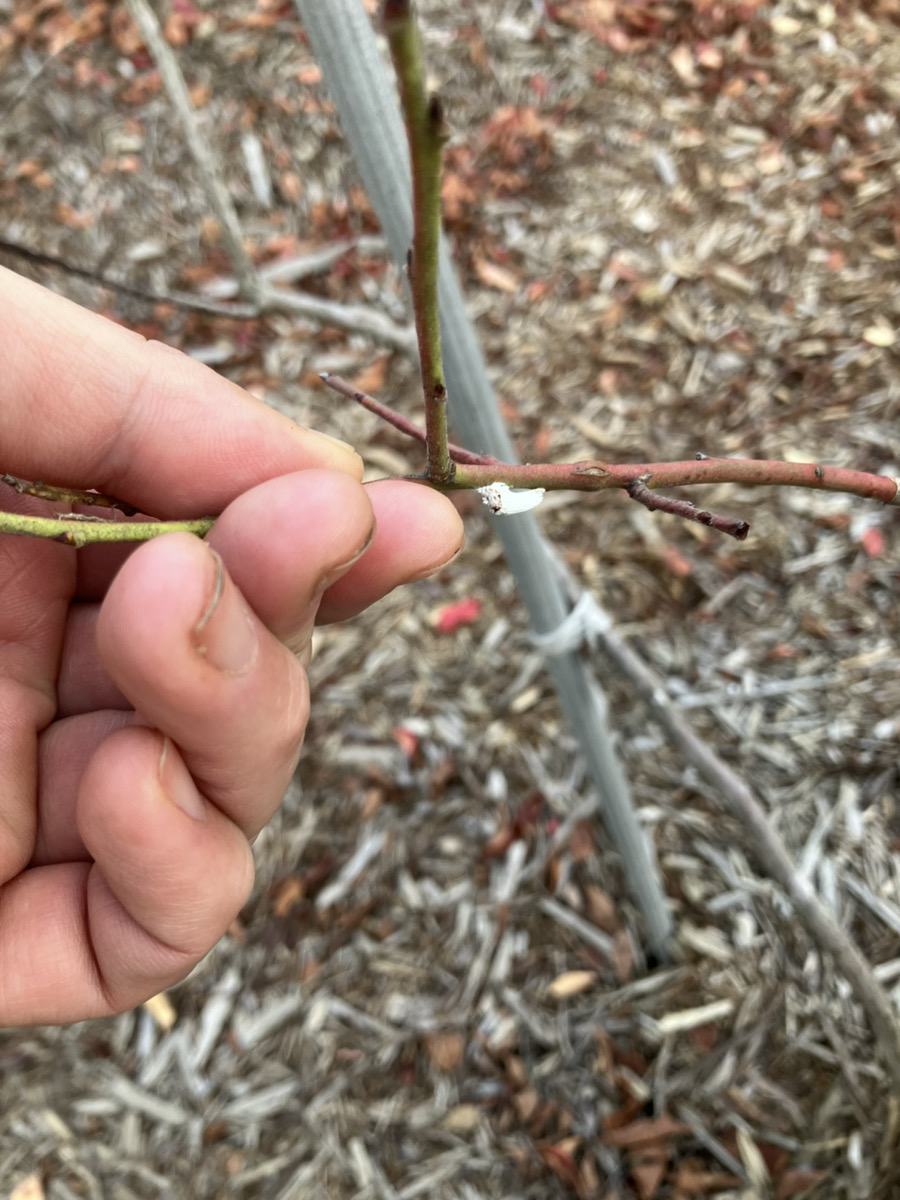 カイガラムシは、セミやアブラムシの仲間で、植物の樹液を吸って生育を阻害する吸汁性害虫です。貝殻のような殻(介殻)や綿のような分泌物で覆われ、体長は数ミリ程度と小さく、種類が非常に多いのが特徴で、庭木・果樹・観葉植物など様々な植物に寄生し、放置すると植物が枯れたり、排泄物で「すす病」を引き起こし葉が黒くなる原因にもなります。農薬や化学肥料を一切使用しないアグリボルタイクス果樹園に於いては当然殺虫剤など使用せずに人間の手で除去しています。